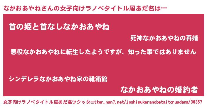 | 男性向けラノベタイトル風あだ名 | 『この素晴らしい世界になかおあやねを!』 |