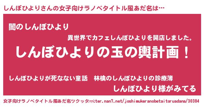 | 男性向けラノベタイトル風あだ名 | 『しんぼひより~年齢イコール彼女いない歴の魔法使い~』 |