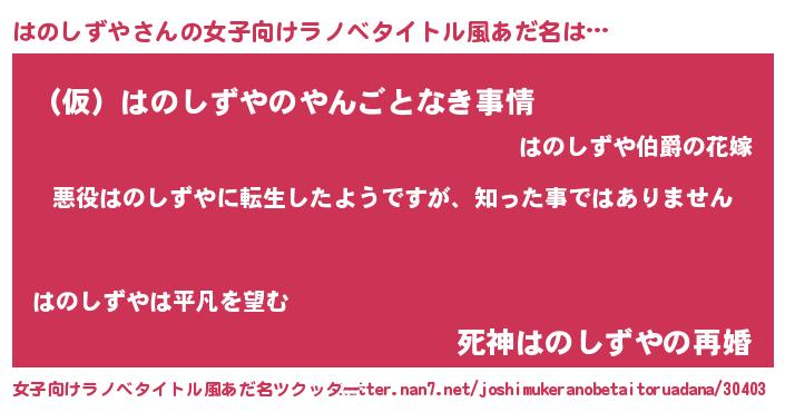 | 男性向けラノベタイトル風あだ名 | 『この素晴らしい世界にはのしずやを!』 |