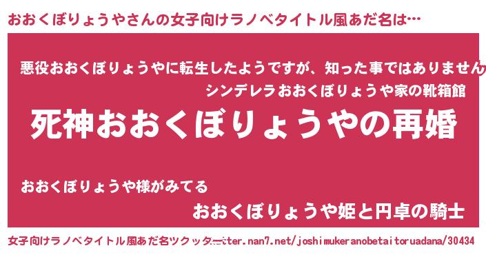 | 男性向けラノベタイトル風あだ名 | 『ノーゲーム・ノーオオクボリョウヤ』 |