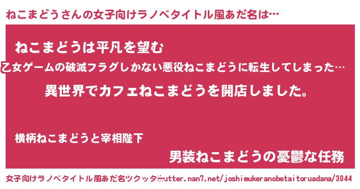 ねこまどうさんの女子向けラノベタイトル風あだ名は… 『異世界でカフェねこまどうを開店しました。』『ねこまどうは平凡を望む』『男装ねこまどうの憂鬱な任務』 ツクッター #女子向けラノベタイトル風あだ名ツクッター http://tkutter.nan7.net/joshimukeranobetaitoruadana/3044/