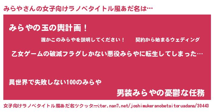 | 男性向けラノベタイトル風あだ名 | 『この素晴らしい世界にみらやを!』 |
