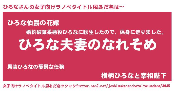 | 男性向けラノベタイトル風あだ名 | 『おまえをオタクにしてやるから、俺をひろなにしてくれ! 』 |