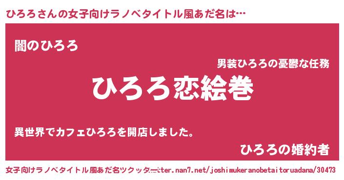 | 男性向けラノベタイトル風あだ名 | 『おまえをオタクにしてやるから、俺をひろろにしてくれ! 』 |