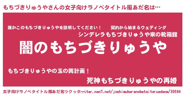 | 男性向けラノベタイトル風あだ名 | 『Re:もちづきりゅうやから始める異世界生活』 |