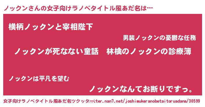 | 男性向けラノベタイトル風あだ名 | 『魔弾の王とノックン』 |