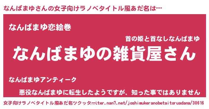 | 男性向けラノベタイトル風あだ名 | 『やはりなんばまゆの青春ラブコメはまちがっている 』 |
