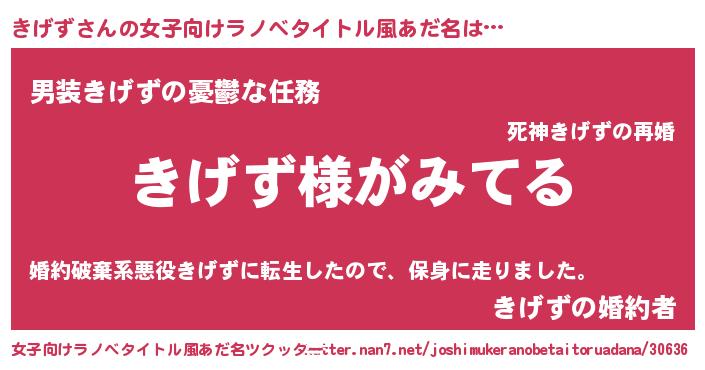 | 男性向けラノベタイトル風あだ名 | 『きげずの嫁は女の子じゃないと思った?』 |