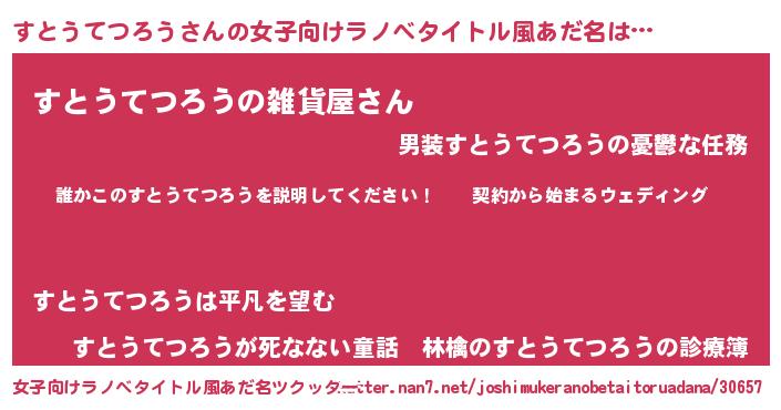 すとうてつろうさんの女子向けラノベタイトル風あだ名は… 『誰かこのすとうてつろうを説明してください! ~契約から始まるウェディング~』『すとうてつろうの雑貨屋さん』『すとうてつろうが死なない童話 林檎のすとうてつろうの診療簿』 ツクッター #女子向けラノベタイトル風あだ名ツクッター http://tkutter.nan7.net/joshimukeranobetaitoruadana/30657/