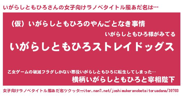 | 男性向けラノベタイトル風あだ名 | 『Re:いがらしともひろから始める異世界生活』 |