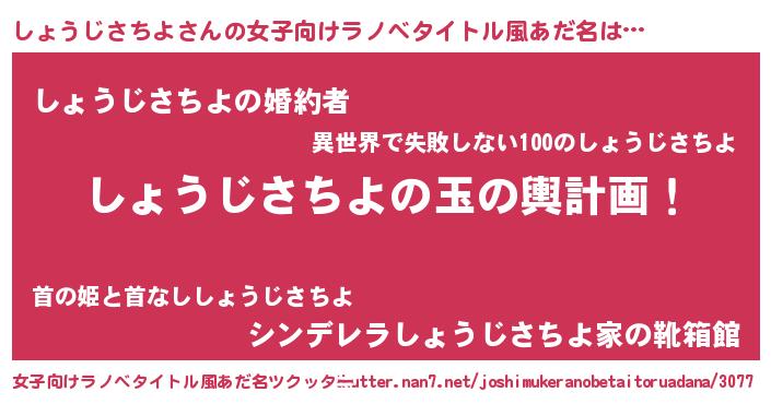 | 男性向けラノベタイトル風あだ名 | 『しょうじさちよ~年齢イコール彼女いない歴の魔法使い~』 |