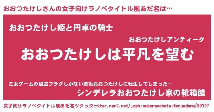 | 男性向けラノベタイトル風あだ名 | 『ダンジョンにおおつたけしを求めるのは間違っているだろうか』 |