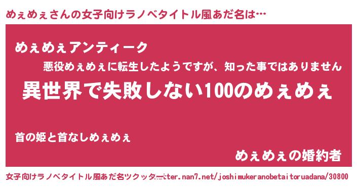 | 男性向けラノベタイトル風あだ名 | 『めぇめぇという概念が存在しない退屈な世界 』 |