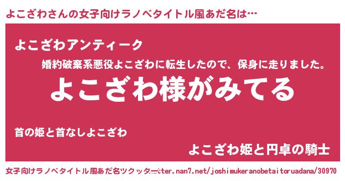 よこざわさんの女子向けラノベタイトル風あだ名は… 『よこざわ様がみてる』『よこざわアンティーク』『よこざわ姫と円卓の騎士』 ツクッター #女子向けラノベタイトル風あだ名ツクッター http://tkutter.nan7.net/joshimukeranobetaitoruadana/30970/