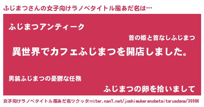 ふじまつさんの女子向けラノベタイトル風あだ名は… 『異世界でカフェふじまつを開店しました。』『ふじまつアンティーク』『ふじまつの卵を拾いまして』 ツクッター #女子向けラノベタイトル風あだ名ツクッター http://tkutter.nan7.net/joshimukeranobetaitoruadana/30986/