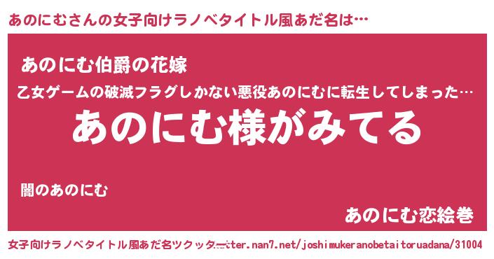 | 男性向けラノベタイトル風あだ名 | 『あのにむの嫁は女の子じゃないと思った?』 |
