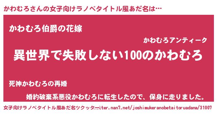 | 男性向けラノベタイトル風あだ名 | 『かわむろという概念が存在しない退屈な世界 』 |