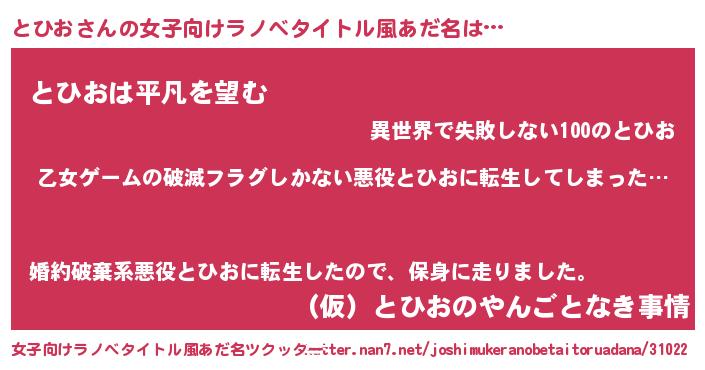 | 男性向けラノベタイトル風あだ名 | 『この素晴らしい世界にとひおを!』 |