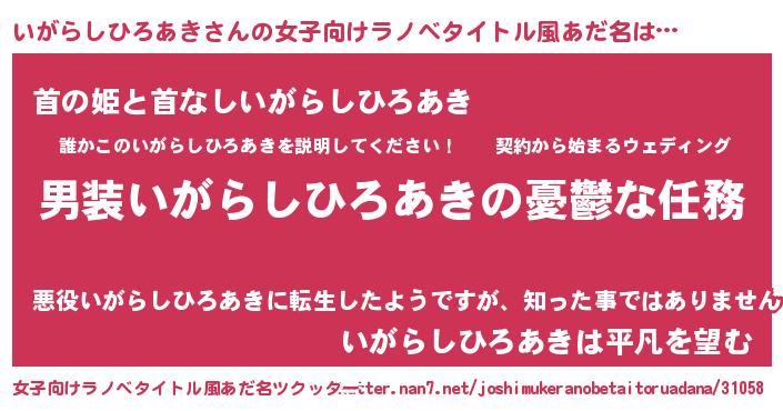 いがらしひろあきさんの女子向けラノベタイトル風あだ名は… 『男装いがらしひろあきの憂鬱な任務』『首の姫と首なしいがらしひろあき』『いがらしひろあきは平凡を望む』 ツクッター #女子向けラノベタイトル風あだ名ツクッター http://tkutter.nan7.net/joshimukeranobetaitoruadana/31058/
