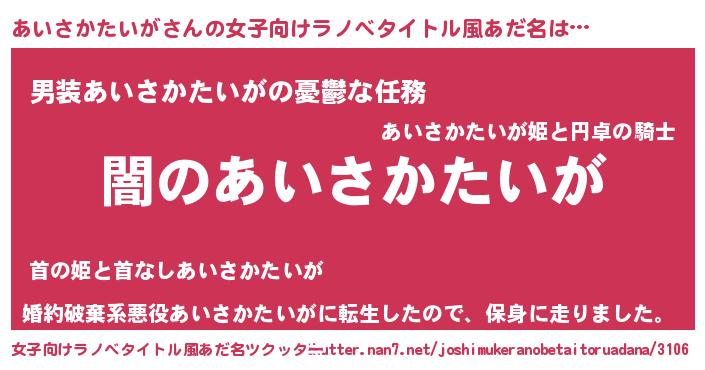| 男性向けラノベタイトル風あだ名 | 『Re:あいさかたいがから始める異世界生活』 |