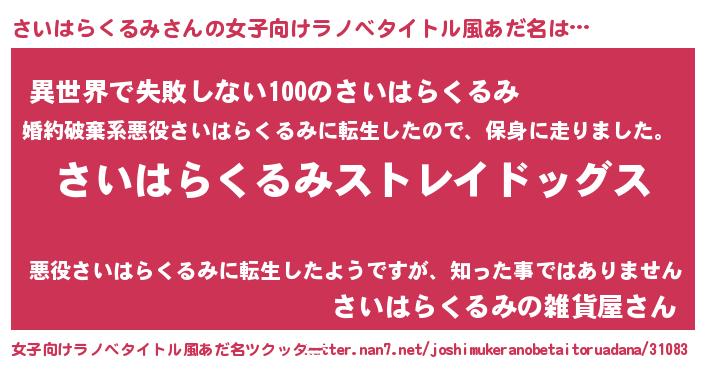 | 男性向けラノベタイトル風あだ名 | 『Re:さいはらくるみから始める異世界生活』 |