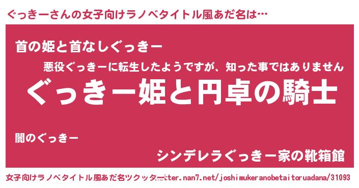 ぐっきーさんの女子向けラノベタイトル風あだ名は… 『ぐっきー姫と円卓の騎士』『首の姫と首なしぐっきー』『シンデレラぐっきー家の靴箱館』 ツクッター #女子向けラノベタイトル風あだ名ツクッター http://tkutter.nan7.net/joshimukeranobetaitoruadana/31093/