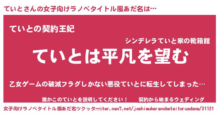 | 胡散臭い通販商品みたいなあだ名 | 『信頼と実績のサプリメント…その名も「ていと」』 |