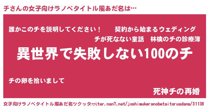 | 男性向けラノベタイトル風あだ名 | 『チという概念が存在しない退屈な世界 』 |
