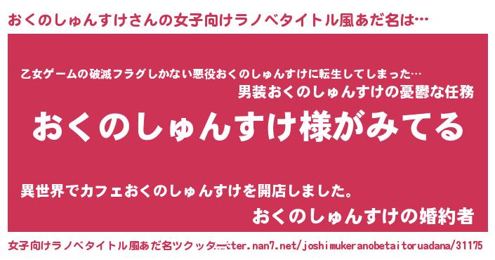 | 男性向けラノベタイトル風あだ名 | 『おくのしゅんすけの嫁は女の子じゃないと思った?』 |