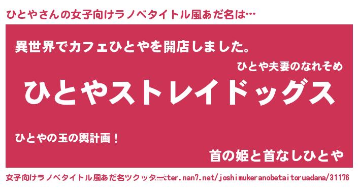 | 男性向けラノベタイトル風あだ名 | 『Re:ひとやから始める異世界生活』 |