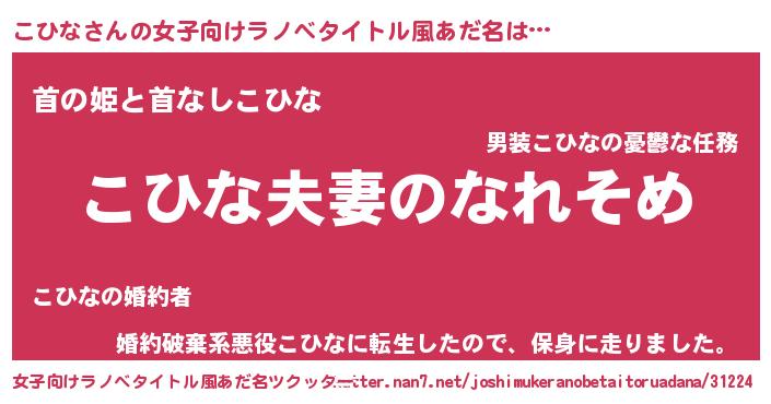 | 男性向けラノベタイトル風あだ名 | 『おまえをオタクにしてやるから、俺をこひなにしてくれ! 』 |