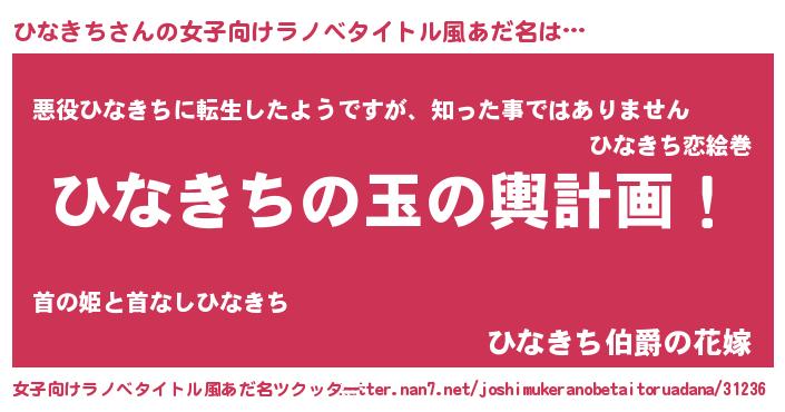 | 男性向けラノベタイトル風あだ名 | 『ひなきち~年齢イコール彼女いない歴の魔法使い~』 |