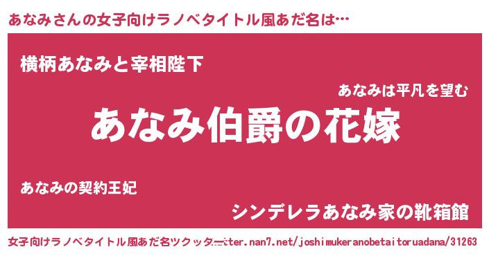 | 男性向けラノベタイトル風あだ名 | 『うちの娘の為ならば、俺はもしかしたらあなみも倒せるかもしれない。』 |