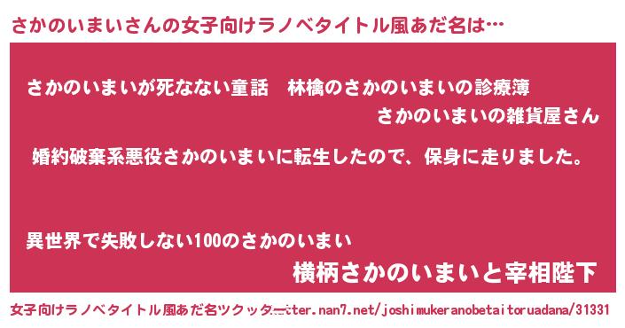 | 男性向けラノベタイトル風あだ名 | 『転生したらさかのいまいだった件』 |