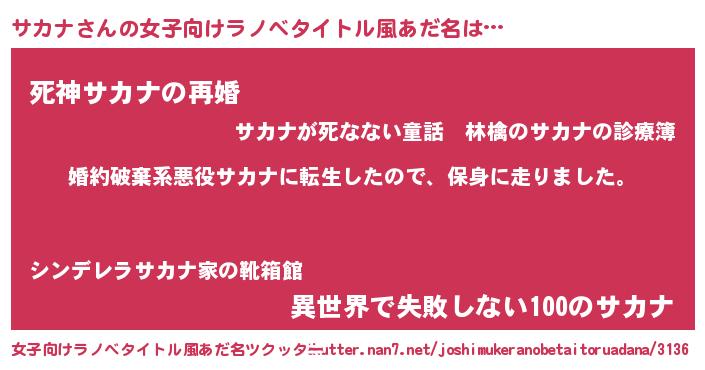 | 男性向けラノベタイトル風あだ名 | 『転生したらサカナだった件』 |