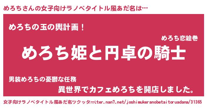 めろちさんの女子向けラノベタイトル風あだ名は… 『めろち姫と円卓の騎士』『めろちの玉の輿計画!』『異世界でカフェめろちを開店しました。』 ツクッター #女子向けラノベタイトル風あだ名ツクッター http://tkutter.nan7.net/joshimukeranobetaitoruadana/31365/