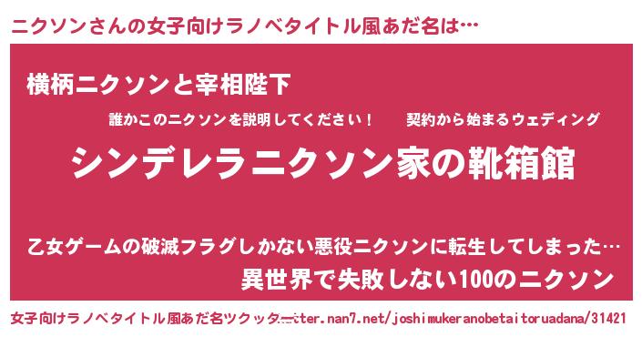 ニクソンさんの女子向けラノベタイトル風あだ名は… 『シンデレラニクソン家の靴箱館』『横柄ニクソンと宰相陛下』『異世界で失敗しない100のニクソン』 ツクッター #女子向けラノベタイトル風あだ名ツクッター http://tkutter.nan7.net/joshimukeranobetaitoruadana/31421/
