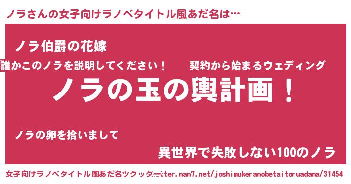 | 男性向けラノベタイトル風あだ名 | 『ノラ~年齢イコール彼女いない歴の魔法使い~』 |
