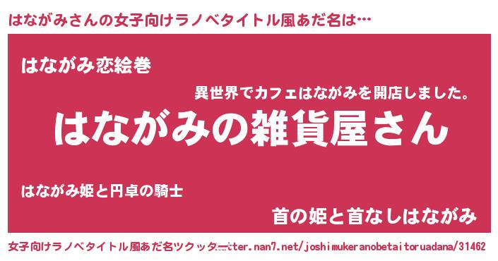 | 男性向けラノベタイトル風あだ名 | 『やはりはながみの青春ラブコメはまちがっている 』 |