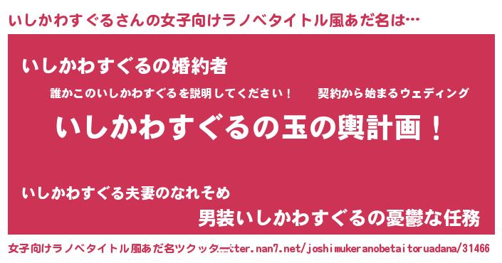 | 男性向けラノベタイトル風あだ名 | 『いしかわすぐる~年齢イコール彼女いない歴の魔法使い~』 |