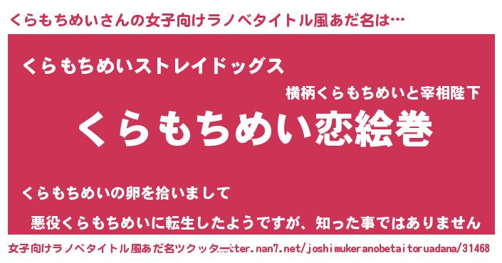 | 男性向けラノベタイトル風あだ名 | 『おまえをオタクにしてやるから、俺をくらもちめいにしてくれ! 』 |