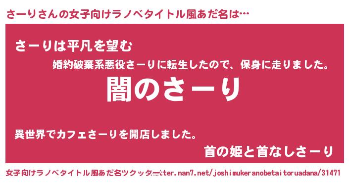 | 男性向けラノベタイトル風あだ名 | 『Re:さーりから始める異世界生活』 |