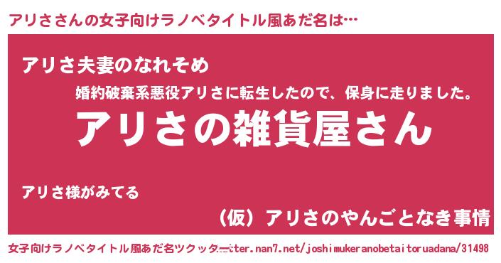 | 男性向けラノベタイトル風あだ名 | 『やはりアリさの青春ラブコメはまちがっている 』 |