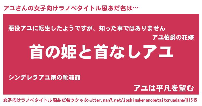 | 男性向けラノベタイトル風あだ名 | 『はたらくアユさま!』『緋弾のアユ』 |