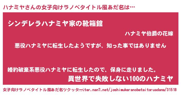 | 男性向けラノベタイトル風あだ名 | 『この素晴らしい世界にハナミヤを!』 |