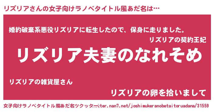 | 男性向けラノベタイトル風あだ名 | 『おまえをオタクにしてやるから、俺をリズリアにしてくれ! 』 |
