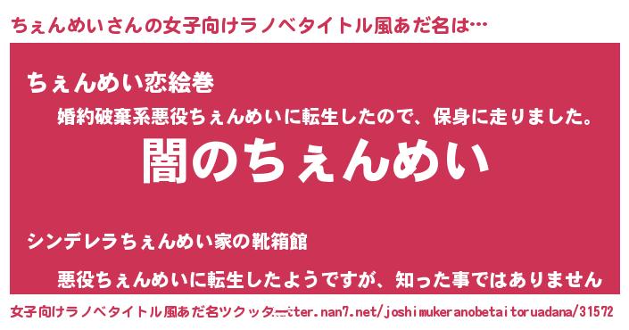 | 男性向けラノベタイトル風あだ名 | 『Re:ちぇんめいから始める異世界生活』 |