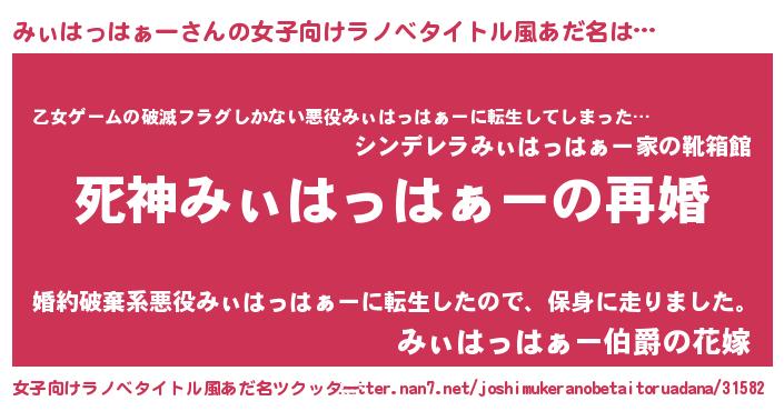 | 男性向けラノベタイトル風あだ名 | 『ノーゲーム・ノーミィハッハァー』 |