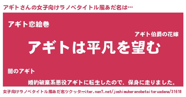 | 胡散臭い通販商品みたいなあだ名 | 『信頼と実績のサプリメント…その名も「アギト」』 |