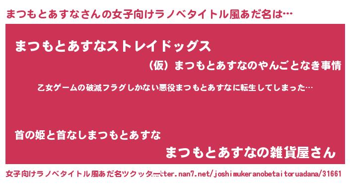 | 男性向けラノベタイトル風あだ名 | 『この素晴らしい世界にまつもとあすなを!』 |